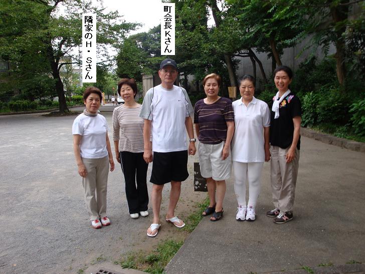 桜橋まで来ると6時20分。リバーサイドスポーツセンタの横道から、山谷堀公園にでる。久し振りにラジオ体操とやらをやってみる気になったので、聖天公園に入る。隣家のH・S夫人も見えていて、少々お話をした。体操が終って、町会長のKさんを中心に婦人会の面々で写真を撮らせて頂いた。