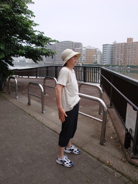 吾妻橋をわたり、何時ものコースで白鬚橋の袂の隅田川リバーサイドなんとやらのデカビルの広場の前で、婆様体操を始めだした。その間爺は下の親水テラスに降りて、一休み。