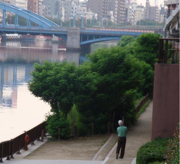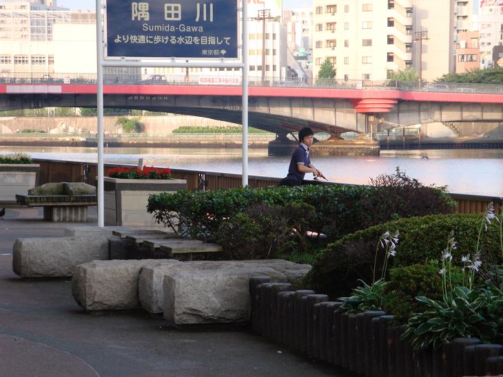 今日は日曜日、言問橋 脇のテラスで釣りを楽しんでいる人がいる。爺が浅草に来た頃はこの辺りは溝(どぶ)川にもまさる、悪臭が漂っていたのに、何が釣れるのかは知らないが、釣り糸を下げる人で賑わっている。なんとも不思議に思えるのであった。