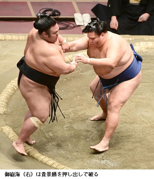 ▽隠岐の海に関脇 御嶽海は隠岐の海が下手投げ。
