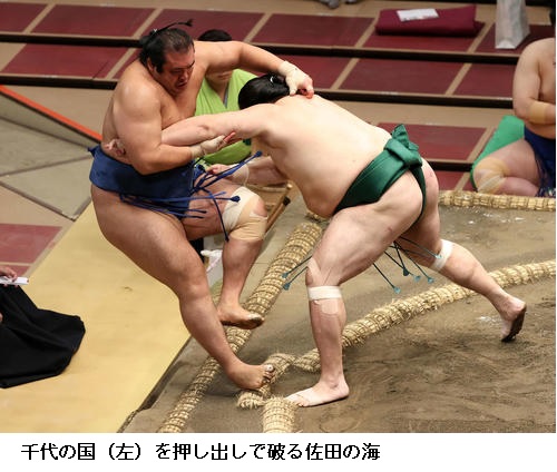 ▽十両の佐田の海に千代の国は、佐田の海が押し出しで勝ちました。千代の国は今場所初黒星です。