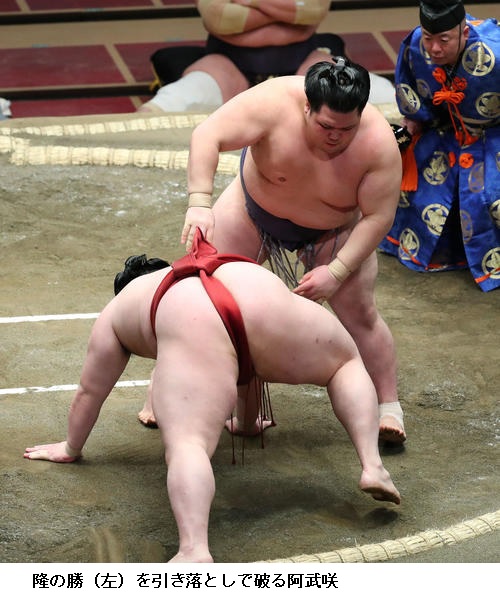 ▽阿武咲に関脇 隆の勝は阿武咲が引き落としで勝ちました。