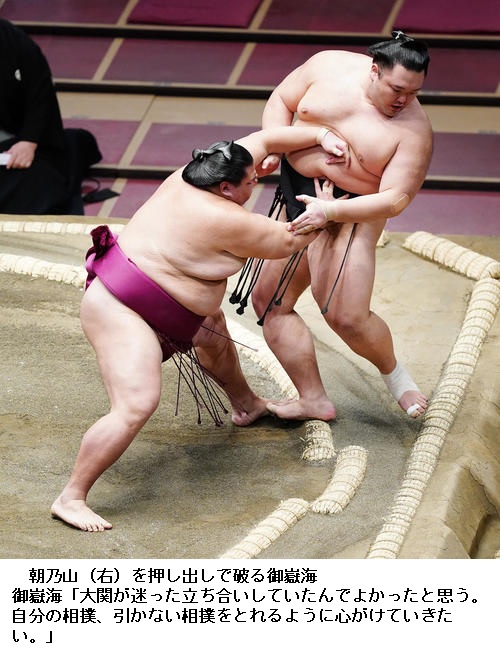 ▽御嶽海は大関・朝乃山に快勝し「大関が迷った立ち合いをした。状態は悪くないと思うので、しっかり自分の相撲、引かない相撲を心がけていきたい」と淡々と話していました。 (NHK WEB NEWS 2021年1月12日 22時33分)