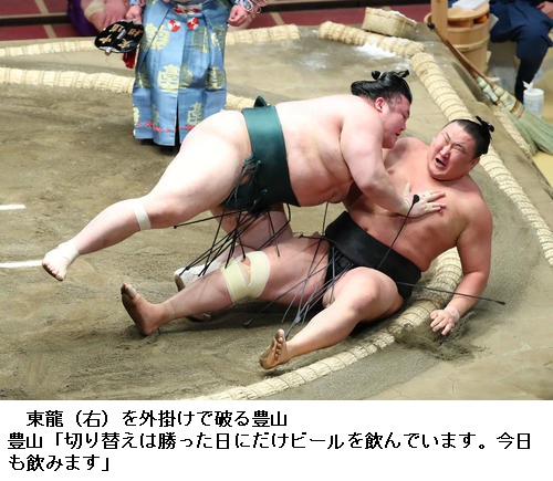 豊山は勝って3勝1敗とし「前半戦でこれだけ勝っているのは久々なので何とも言えない。目標は勝ち越しなので、あと五番勝てるように1日1日必死にやっていきたい」と話していました。