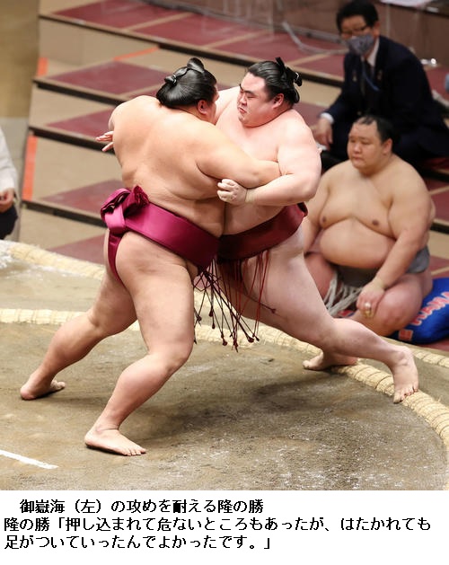 3勝目をあげた関脇・隆の勝は「上体で行き過ぎず下半身で相撲を取れたのでよかった。このまま下半身がぶれず、ちゃんと前に攻める自分の相撲取れればいい」と手応えを感じている様子でした。