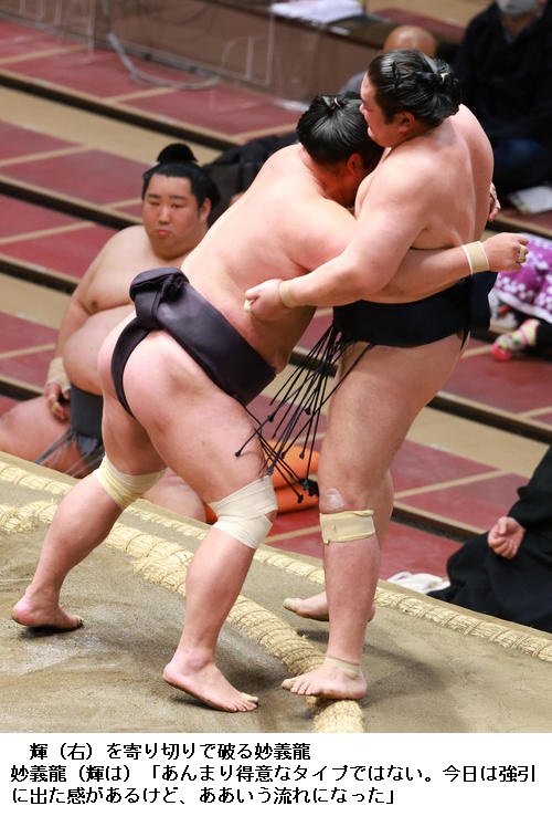 妙義龍は星を五分に戻し「土俵際まで詰めていけたのでそれはよかった。調子は別に悪くない。相撲を取れることに感謝して全力でいくだけだ」と話していました。