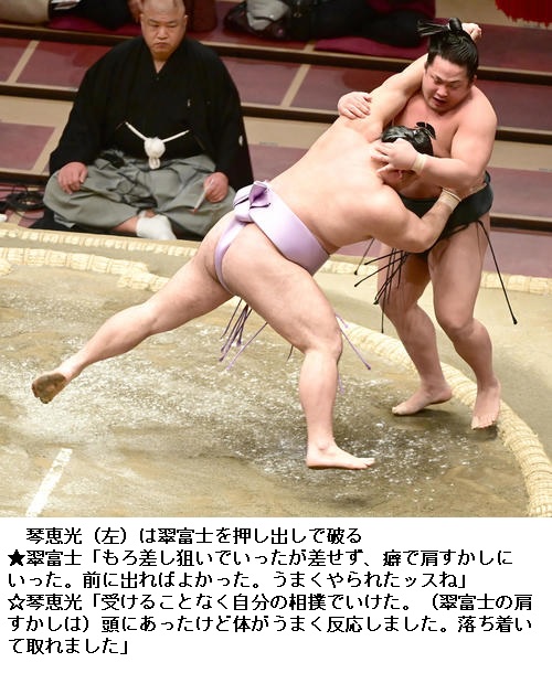 ▽新入幕の翠富士に琴恵光は、琴恵光が押し出し。