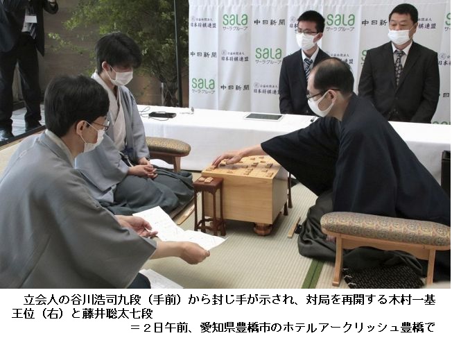 初日の封じ手場面、先輩棋士に「一日の長」を見せつけられた。初めて体験した封じ手。用紙の入った封筒の署名を忘れ、木村に指摘を受けた。立会人の深浦康市九段(48)からは封筒を差し出す向きも指導された。初の2日制7番勝負で、初々しさを見せたのは、この場面だけだった。
