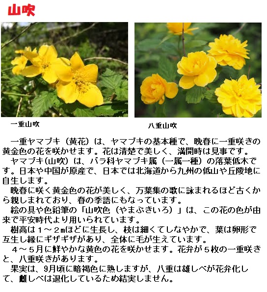 山吹はバラ科の落葉低木です。低い山地や水辺に生えます。一重山吹、八重山吹、などがあります。3月から5月にかけて、鮮やかな黄色の花がきれいですね。なお、八重山吹には実ができません。