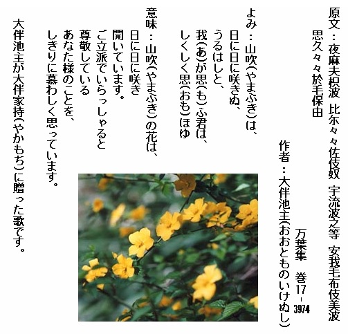 巻17-3968: 鴬の来鳴く山吹うたがたも君が手触れず花散らめやも