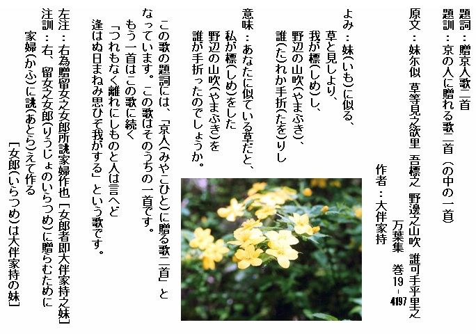巻19-4197: 妹に似る草と見しより我が標し野辺の山吹誰れか手折りし