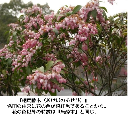 アセビに「馬酔木」の字を当てているのは、一説に中国からの渡来人に伴われて来た馬が食べて酔っ払ったようになったためといわれます。アセビの語源ははっきりしないが「足しびれ」から来たともいわれます。万葉集にも多く詠まれた万葉植物です。