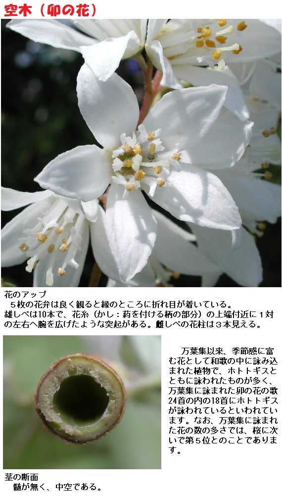 ユキノシタ科ウツギ属の落葉低木である空木(うつぎ)の花のことです。日本原産です。5月頃に白い5弁の花を沢山咲かせます。幹の中が中空で、空ろな木だから「空木(うつぎ)」だということです。