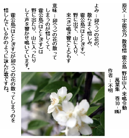 巻10-1957: 卯の花の散らまく惜しみ霍公鳥野に出で山に入り来鳴き響もす
