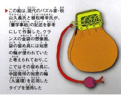 何れの年なりしか、右にいふカランスといへる甲比丹(カピタン)参向の時なりしが、ある日、かの客屋に人集まり酒宴ありし時、源内もその座に列なりありしに、カランス戯れに一つの金袋を出し、この口試みに明け給ふべし。あけたる人に参らすべしといへり。その口は知恵の輪にしたるものなり。座客次第に伝へさまざま工夫すれども、誰も開き兼ねたり。遂に末座の源内に至れり。源内これを手に取り暫く考へ居しが、たちまち口を開き出せり。座客はいふに及ばず、カランスもその才の敏捷なるに感じ、直にその袋を源内に与へたり。