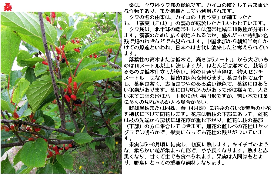 桑はクワ科の落葉高木です。雌雄異株か雌雄同株です。4月頃から花をつけ、5月頃から赤い実をつけます。実は、夏になると黒く熟して食べられるようになります。