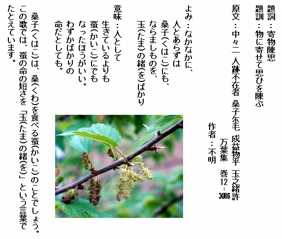 巻12-3086: なかなかに人とあらずは桑子にもならましものを玉の緒ばかり