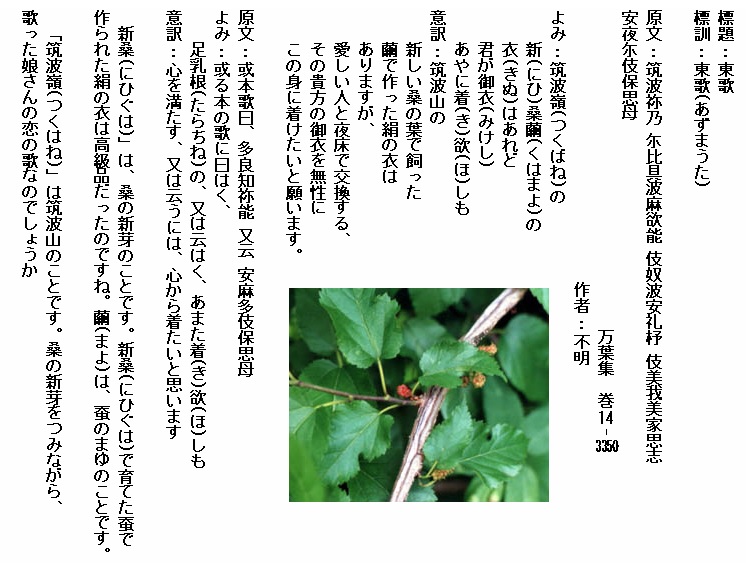 巻14-3350: 筑波嶺の新桑繭の衣はあれど君が御衣しあやに着欲しも