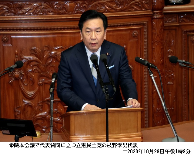 任命除外、首相「私が判断」 枝野氏「支離滅裂」と批判 ―― 菅義偉首相が就任して初の国会で、28日午後の衆院代表質問では自民党と立憲民主党の3人が質問に立った。このうち立憲の枝野幸男代表は質問後、菅首相の答弁について、記者団に「ほとんど正面からのお答えはなかった」と批判した。