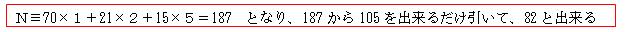 N≡70×2+21×1+15×2=191 となり、191から105を出来るだけ引いて86を答えることができる。