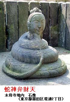 また、蛇は脱皮をすることから「復活と再生」を連想させ、餌を食べなくても長く生きることから「神の使い」として崇められ、全国各地に蛇神を祀っている神社がある。たとえば、七福神のひとつである「弁財天」は蓄財と芸能の女神であるが、蛇の形をした神として祀られていることも多い。日本神道古来の神である宇賀神とも習合して一体化し、弁天の頭上に宇賀神が載っている像や蛇身の弁天像もある。宇賀神は日本固有の神で、老人の頭を持ち身体は白蛇(人頭蛇身)の姿をしていて、農業・食物・財福の神とされる。また、蛇の抜け殻を財布に入れて蓄財を願うなど、お守りにする風習が今でもみられる。