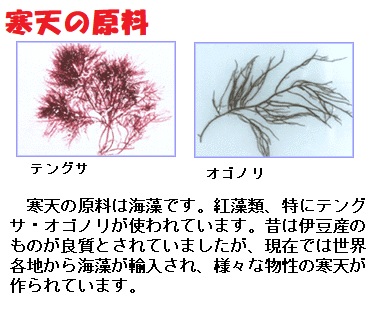 テングサ・オゴノリなどの紅藻類を煮溶かして固めたもの(ところてん)をいったん凍結したのち乾燥した製品です。寒晒(かんざら)しでつくる「ところてん」の意味からこの名があるといいます。