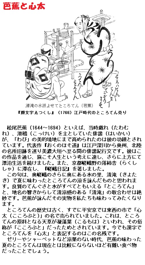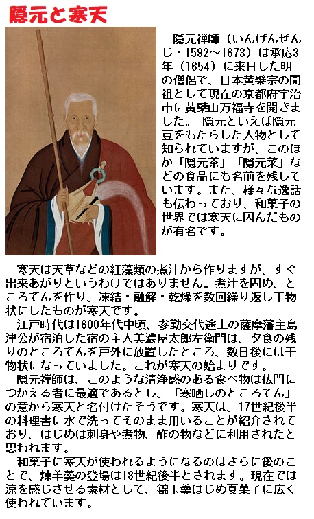 1658年(万治1)の冬、参勤交代途上の島津侯が京都伏見(ふしみ)の旅宿美濃屋(みのや)太郎左衛門方で、食べ残しのところてんを戸外へ捨てたところ、寒夜のもとで凍結し、日中になると解けて乾燥し、鬆(す)の入った乾物になった。これをヒントに宿の主人が創製して売り出したのが寒天の始まりといいます。寒天の命名者は隠元隆(いんげんりゅうき)とも伝えられます。