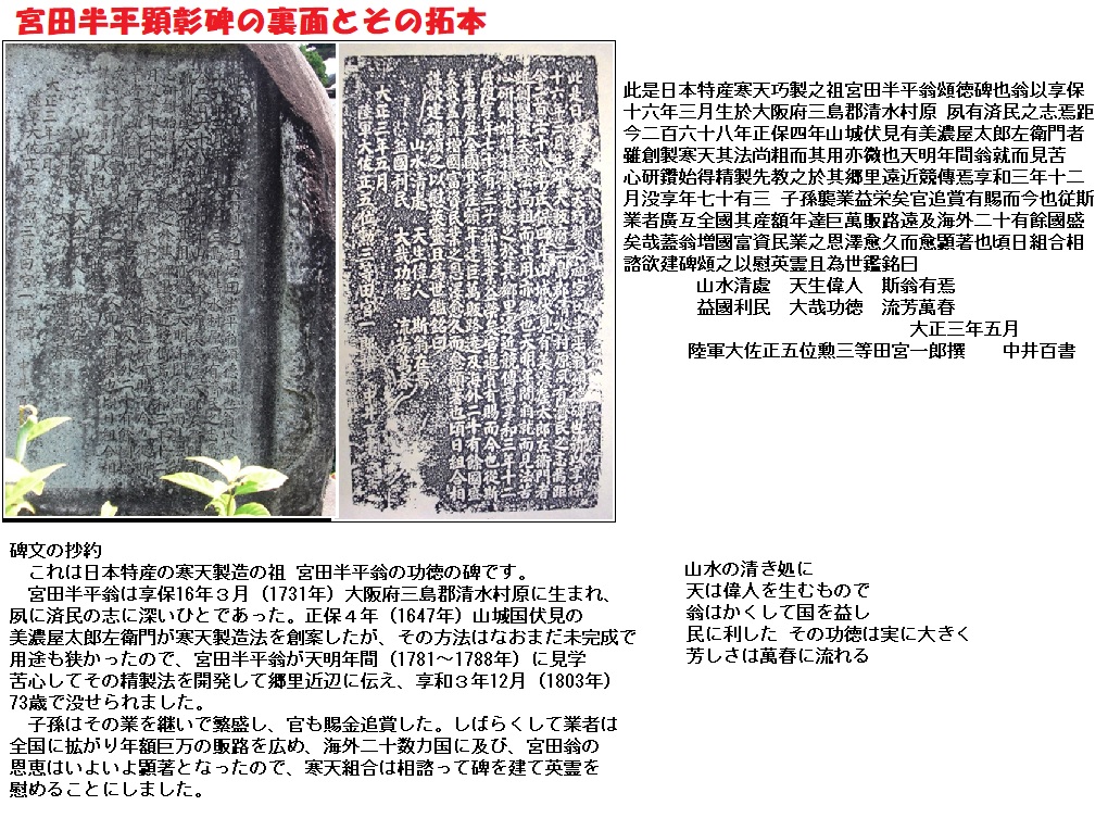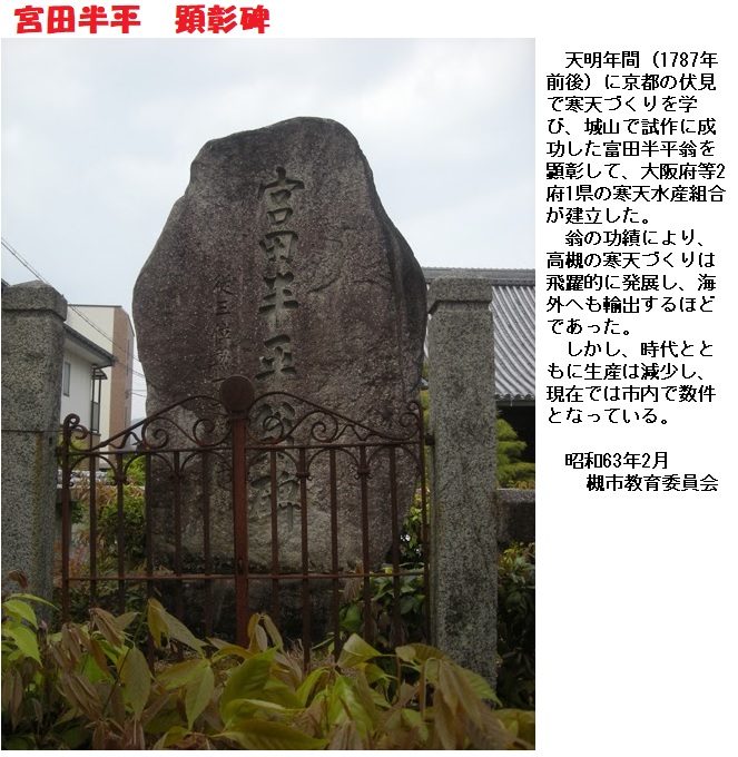 明和(めいわ)年間(1764~72)に摂津(大阪府)島上郡の宮田半平が伏見の寒天製法を習って大規模な製造を始めましたが、天保(てんぽう)年間(1830~44)に信濃(しなの)国(長野県)諏訪(すわ)に伝わり、自然条件に恵まれた同地の名物となりました。