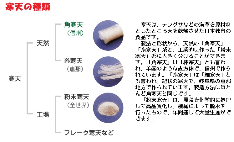 天然寒天と工業寒天(フレーク状、パウダー状など)に大別されます。天然寒天には棒(角)寒天と糸(細)寒天があり、冬季、屋外で自然凍結、自然解凍、天日乾燥でつくられます。両者の大きな工程上の違いは、ところてん(寒天ゲル)の脱水方法にあれのす。天然寒天の製法は、乾燥したテングサなどの原藻を水で煮て木箱に入れて固め、これを戸外に並べ、1週間ぐらい零下5~零下10℃の寒気で凍結、5~10℃の低温で乾燥を繰り返します。原藻を煮溶かすときの水は、鉄分の少ないものがよいとされます。ゼリー状のところてんは、凍結により寒天質と氷の結晶に分かれ、これが溶けるときに、寒天質と水とが分離します。
