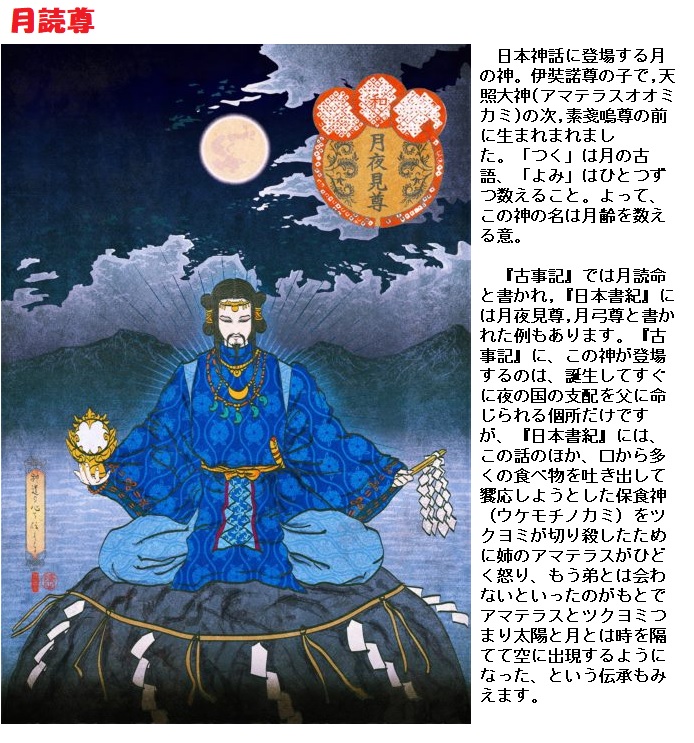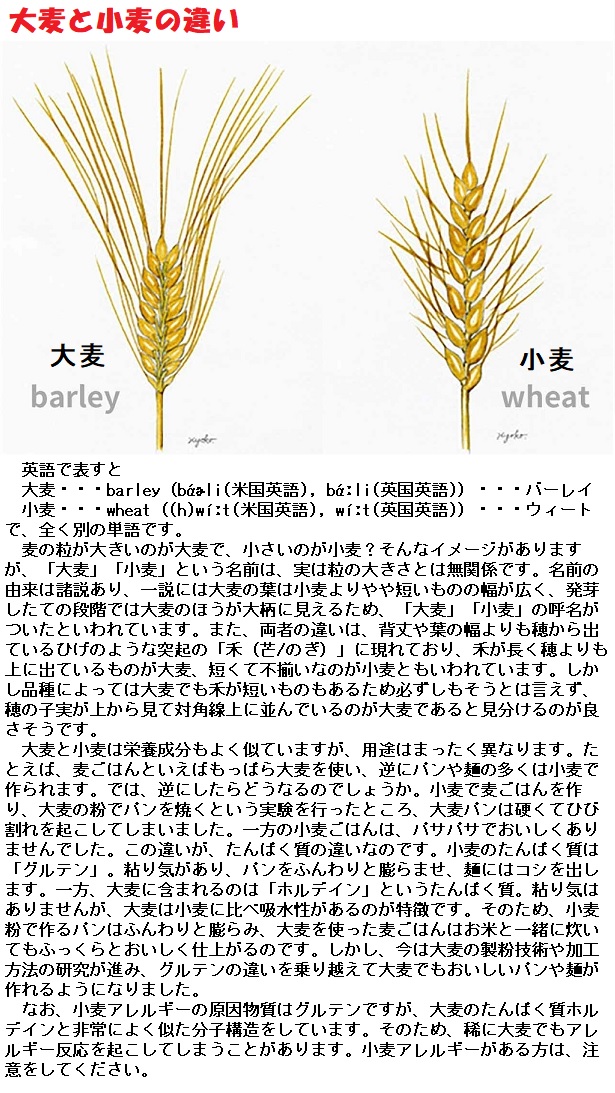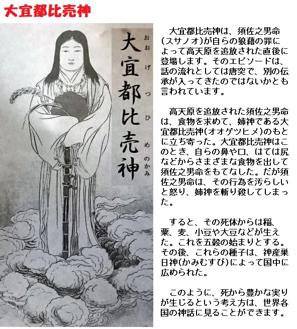 日本へのコムギの伝来は、オオムギより1世紀ほど後の4~5世紀ごろとされ、大陸の農耕文化とともに、オオムギ、ダイズ、アズキなどが 朝鮮半島を経てきました。日本では「古事記」「日本書紀」の中にも 穀物の女神が 登場します。古事記では大宜都比売(おおげつひめ)と スサノオのペアで、日本書紀では 月読尊と保食神のペアで登場します。