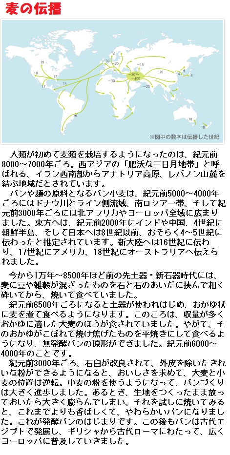 紀元前3000年には 中国でコムギの栽培が始まり、紀元前2000年には、石臼が考案され白いコムギ粉の採取が可能となります。紀元前1000年にはメソポタミア流域にマカロニコムギが出現します。これがシルクロードを渡ってイタリアのパスタとなりました。