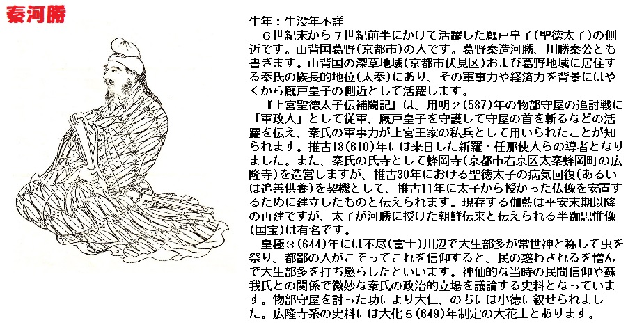 推古天皇と言えば、飛鳥時代 摂政は聖徳太子でした。この聖徳太子の側近(ブレーン)に秦河勝という人がいました。この人は、養蚕・機織・管弦.楽舞、能楽の祖の 秦一族で、聖徳太子から仏像を賜って,奈良の葛野に蜂岡寺(はちおかでら)(広隆寺)を建立し,新羅,任那の使者が拝朝したとき、新羅使者の導者を務めたとあり、この時代の交流から、小麦も 伝わったとされます。
