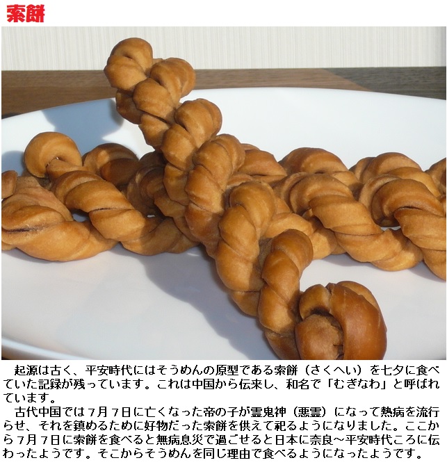 平安時代の『延喜式』(905~927年)には 7月7日の儀式に索餅(さくべい)(そうめんの前身)を用いたことが記されてあります。昔、宮中で七夕の節句に瘧(おこり)よけのまじないとして奉り、縁起物として貴族たちは そうめんを神に供え、無病息災を祈っていたのです。食べられた記録としては、うどんよりも そうめんの方が、古いようです。