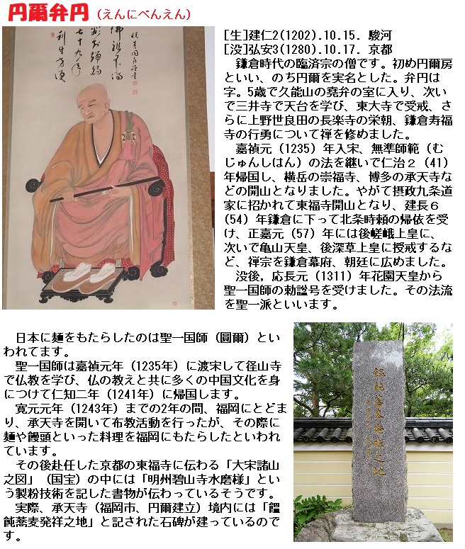 調べると、聖一国師は1241年に宋より帰朝し 製めん法などの文化や技術をもたらしたと書物にあります。聖一国師は 鎌倉時代の高僧で、静岡茶の始祖と伝えられている人です。聖一国師は 宗国より仏書千余巻とともに茶の実を持ち帰り、生誕地である駿河国の地にそれを蒔いたと伝えられています。博多は、有名な八女茶の産地で うどん文化が今も根付いていますし、静岡は静岡茶が有名ですね。小麦が うどんとして食べられるようになったのと お茶が伝来した時期が 一緒だったのですね。