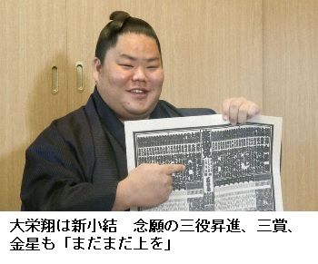 ▽新三役 西小結大栄翔が新三役。追手風部屋からは18年夏場所の遠藤以来、埼玉県からは今年名古屋場所の阿炎以来、戦後5人目。