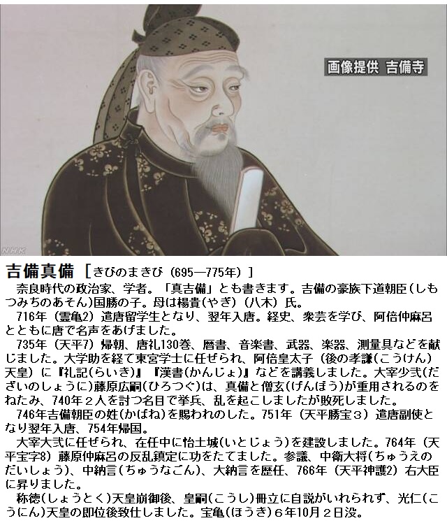 吉備真備は、のちの菅原道真と並ぶ学者政治家で、儒教や兵法などに通じていたとされる。695年に下級官人の家に生まれ、遣唐使の一員として、のちに唐で官僚になった阿倍仲麻呂らと一緒に717年に唐に渡り、34年まで留学した。帰国後は聖武(聖武)天皇(701~756)らに重用され、橘諸兄(たちばなのもろえ)(684~757)政権に顧問格として参画。九州に左遷され、遣唐副使に任命され、2度目の唐に渡った。帰国後、称徳天皇・道鏡の政権下で右大臣となり、81歳で死去した。