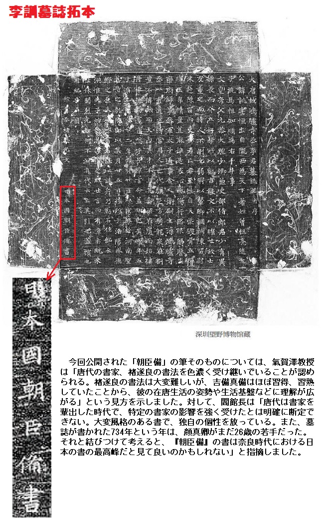墓誌は、6年前に河南省洛陽で見つかり、李訓の生前の経歴などが記されていて、文章の最後に「日本国朝臣備書」と刻まれていました。墓誌を発見した広東省深圳(しんせん)にある博物館の閻焔館長によりますと、日本の「朝臣備」という人物が書いたことを意味し、文字が書かれた年代から、「朝臣備」は遣唐使とともに留学生として唐に渡っていた吉備真備を指すとみられるということです。