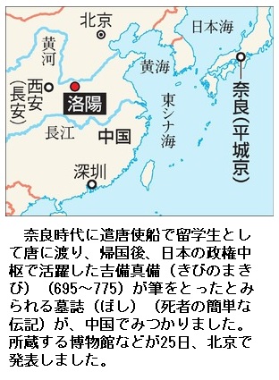 吉備真備筆?の墓誌、中国で発見 留学中書かれた可能性 ―― 奈良時代の高級官僚で政権中枢で政務を執り、2度も遣唐使として唐に渡った吉備真備(きびのまきび)が筆をとったとみられる墓誌(死者の簡単な伝記)が、中国国内でみつかった。所蔵する博物館などが25日、北京で発表した。8世紀前半に真備が留学生として中国滞在中に書かれた可能性が高く、真備の書とすれば国内外で初めて確認されたことになる。中国人の墓誌の銘文を日本人が書いたことが確認されたのも初めて。これまで真備の留学生活を探る文献史料は乏しく、古代東アジア関係の実像を伝える貴重な史料として注目される。