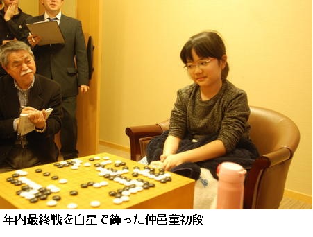 仲邑菫初段19年白星締め、勝率7割8厘同期トップ ――囲碁の最年少プロ、仲邑菫(なかむら・すみれ)初段(10)が26日、大阪市の日本棋院関西総本部で打たれた第46期名人戦予選Cで山田和貴雄七段(50)を破り、年内ラスト対局を白星で飾った。プロ1年目の通算成績は17勝7敗。勝率7割8厘は、同期13人を含む全初段の中で堂々のトップとなった。