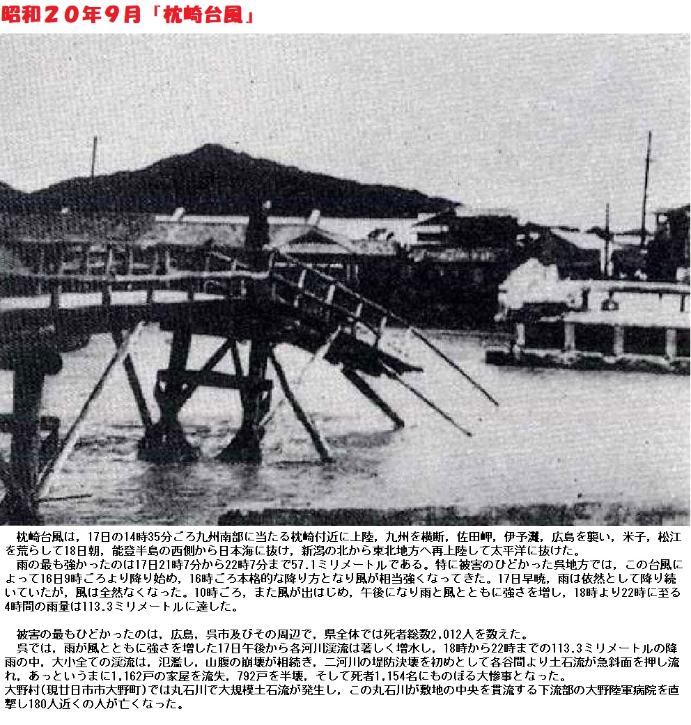 戦後間もなく、9月17日~18日の枕崎台風で、私の通学路であった鳥居橋は崩壊し、方々の田畑は大変な被害を被りました。