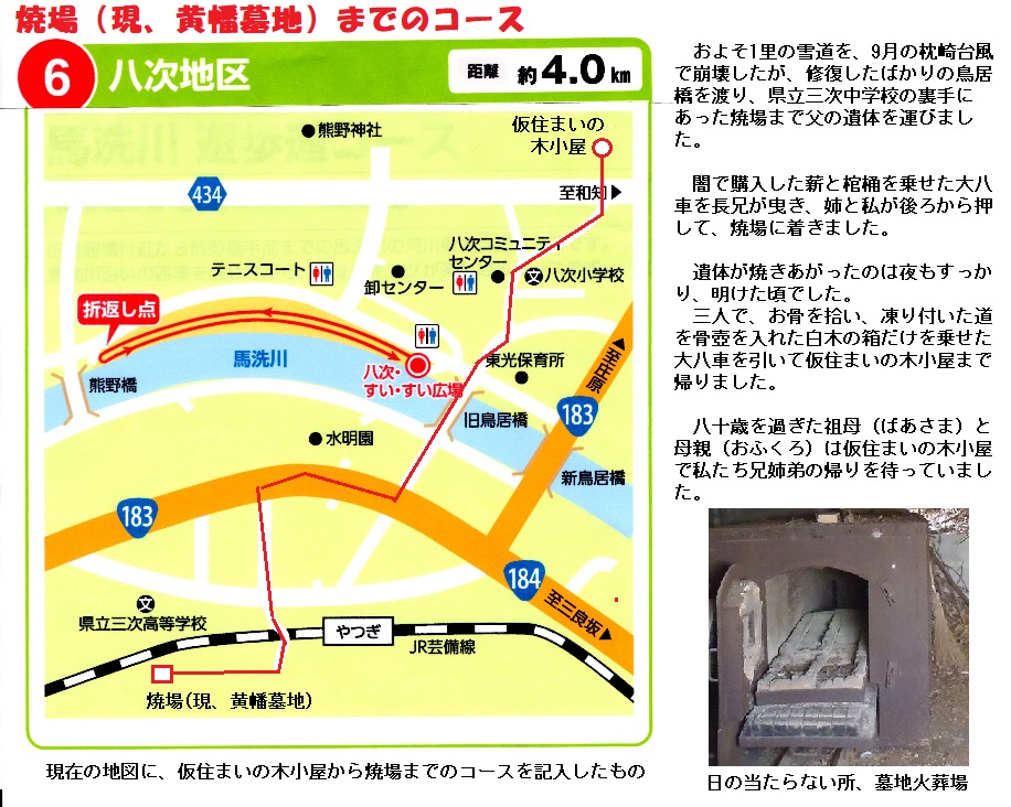 29日の夕刻、親父の遺体を大八車に乗せ、三次中学の線路越しにある焼場に運びました。