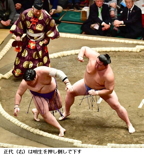 ▽明生に正代は正代が押し倒し。