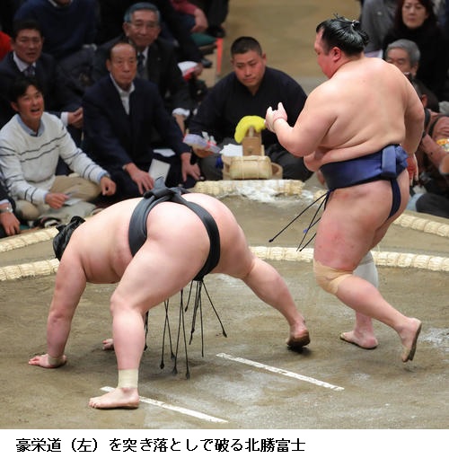 ▽北勝富士に角番の大関 豪栄道は北勝富士が突き落としで勝ちました。