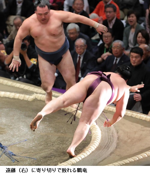 ▽遠藤に横綱 鶴竜は、遠藤が寄り切り。遠藤は金星を挙げました。