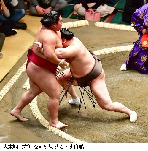 ▽2場所連続優勝をねらう横綱 白鵬に新小結 大栄翔は、白鵬が寄り切りで勝ちました。 (NHK WEB NEWS 2020年1月12日 19時13分)