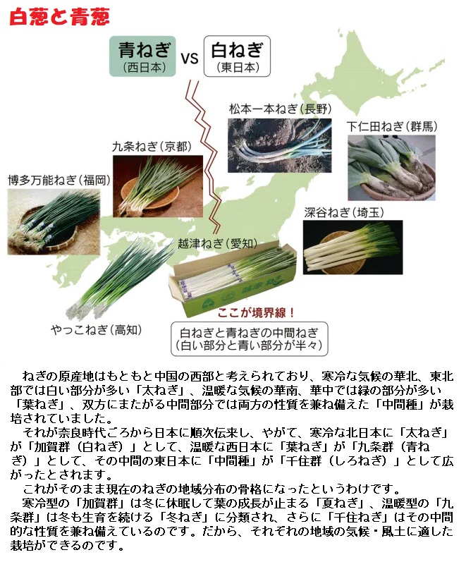 ネギ(葱/ねぎ)はユリ科なのかネギ科なのかは、植物の分類学上の違いで分かれますが、食べる私たちにとってはあまり関係なく、少なくともネギはみな同じ仲間だという事です。一般的に、関東は白ねぎ、関西は青ネギと言われてきたように、関西では青い葉の部分を好み、関東では盛り土をして白い部分を長くしたものを好んできました。でも今では料理によって使い分けるようになりました。