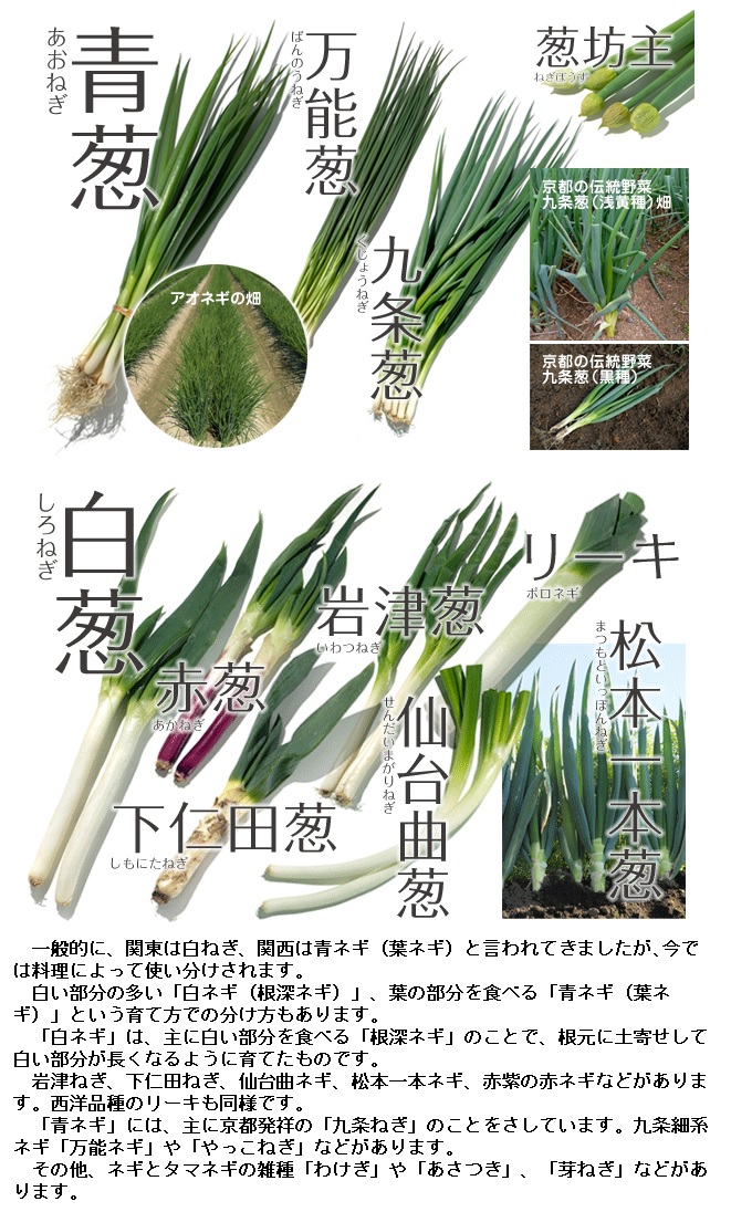 白ネギ(根深ネギ):白ねぎとは主に白い部分を食べる根深ねぎのことで、長ネギなどとも呼ばれ、根元に土寄せして白い部分が長くなるように育てたものです。「加賀ねぎ」、「千住ねぎ」、「下仁田ねぎ」「曲がりネギ」などがあります。