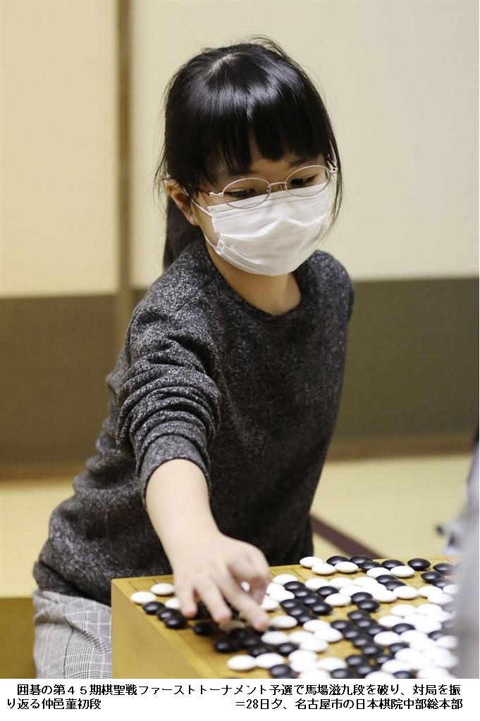 仲邑菫初段が男性棋士に7連勝 馬場九段との61歳差対決制す ―― 囲碁の最年少棋士・仲邑菫初段(10)が28日、名古屋市の日本棋院中部総本部で打たれた第45期棋聖戦ファーストトーナメント2回戦の対局に臨み、馬場滋九段(71)に260手で白番中押し勝ちした。国内棋戦では男性棋士に負けなしの7連勝とした。