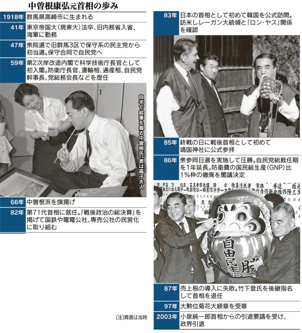 中曽根康弘元首相死去 101歳 改憲提唱、国鉄民営化 ―― 安倍、佐藤、吉田、小泉各内閣に次ぐ戦後第五位の長期政権を担い「戦後政治の総決算」を掲げて国鉄(現JR各社)の分割・民営化を実現した元首相の中曽根康弘(なかそねやすひろ)氏が死去したことが二十九日、分かった。百一歳。群馬県出身。関係者によると、二十九日午前七時すぎ、東京都内の病院で亡くなった。