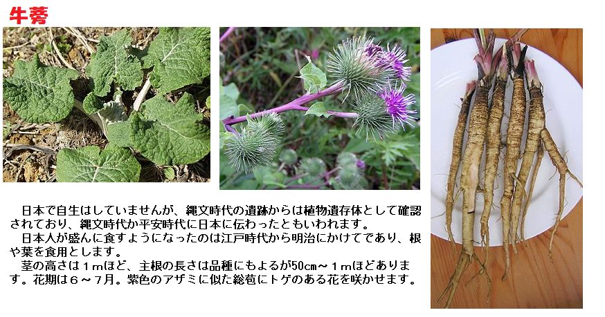 縄文時代の貝塚や三内丸山遺跡からも、牛蒡の種が発見されています。その歴史はとても深いのです。